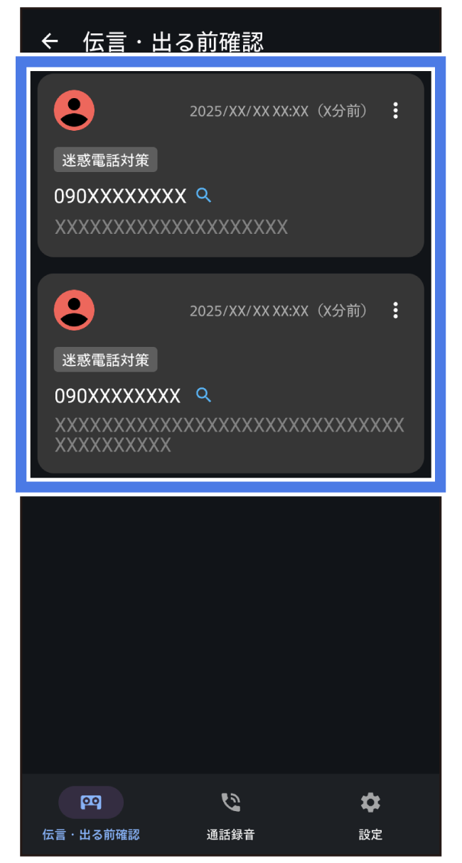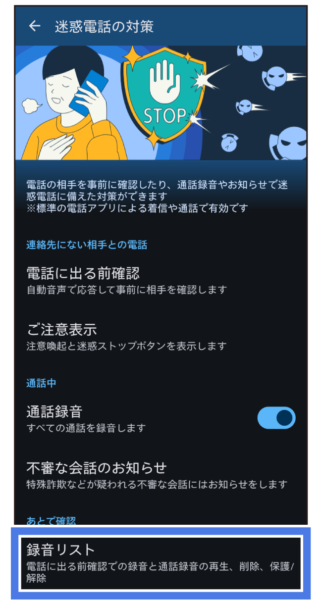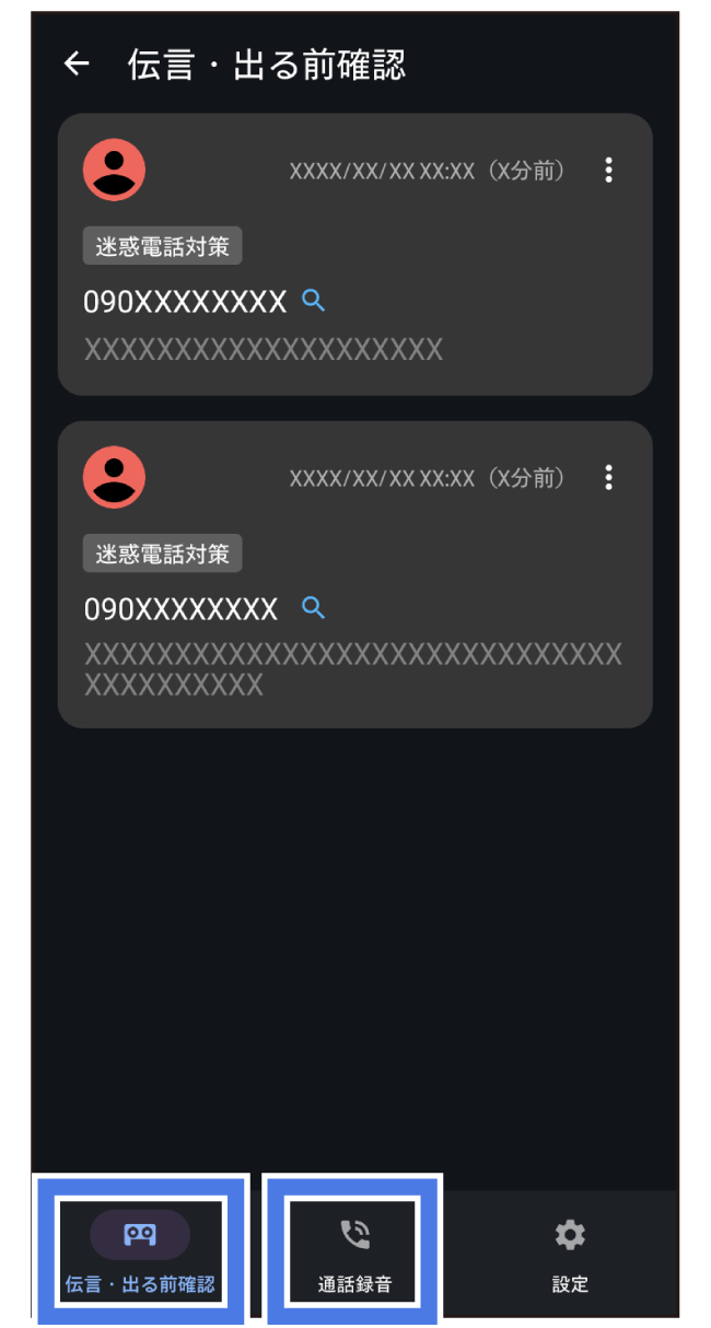 「電話に出る前確認」や「通話録音」で録音した音声は、後から確認することができます。