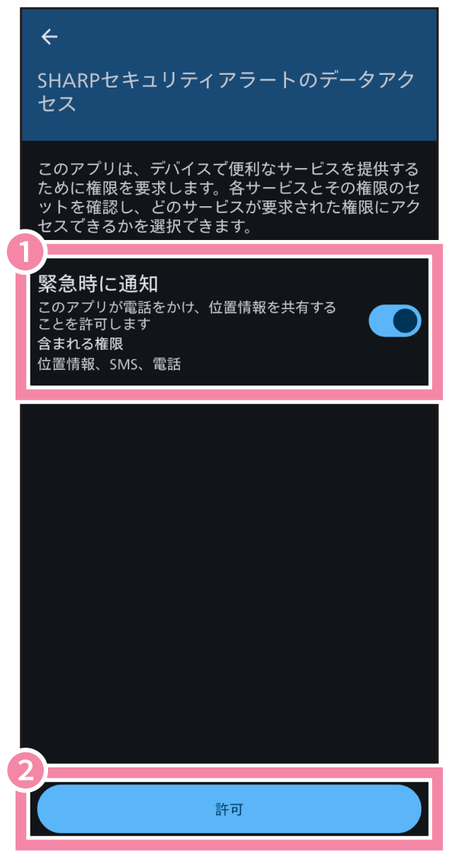 「緊急時に通知」をタップし(①)、「許可」をタップ(②)