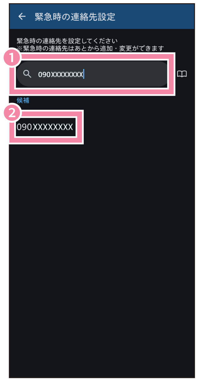 緊急時の連絡先を⼊⼒し(①)、「候補」の連絡先をタップ(②)