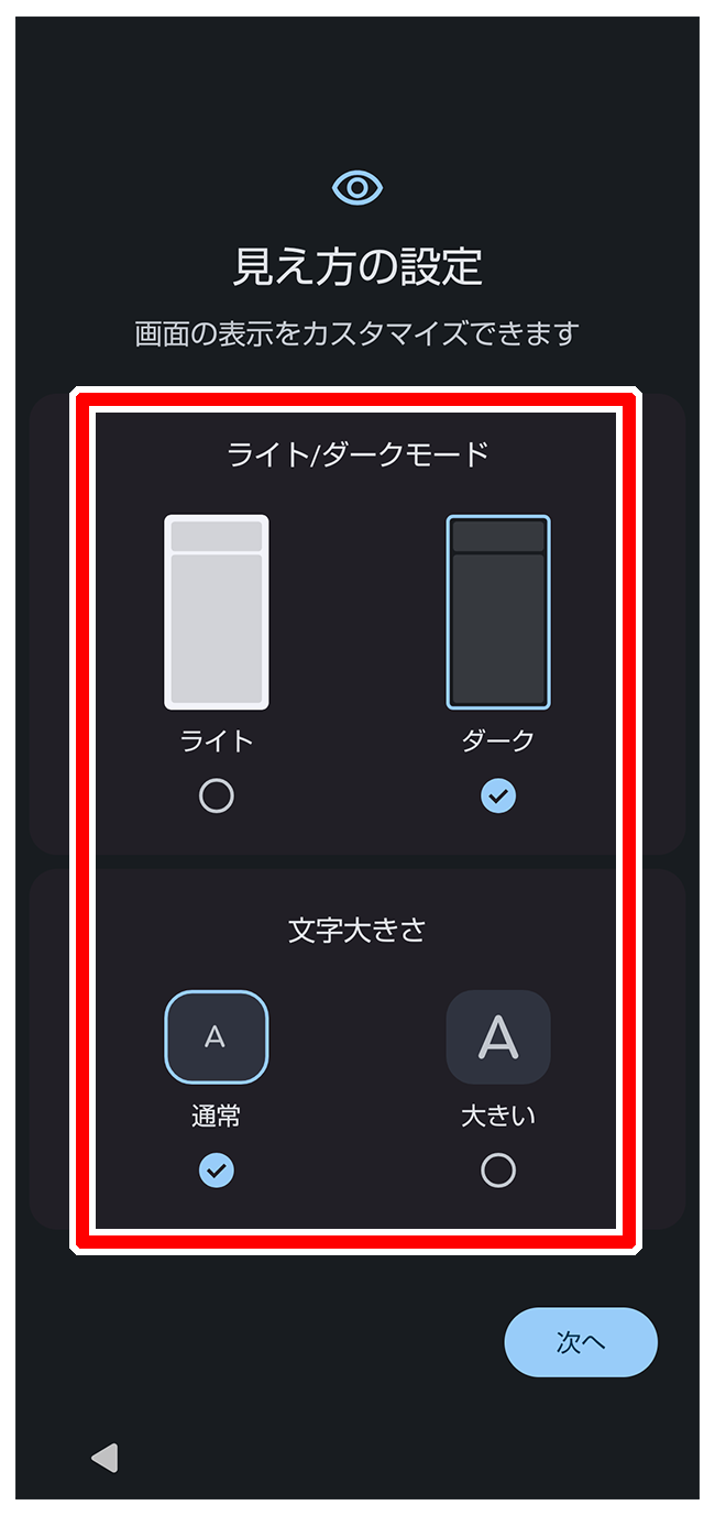 ・変更前の端末からデータを引き継ぐ場合は「次へ」をタッチします。詳しくは、「データの引き継ぎをする」をご参照ください。
