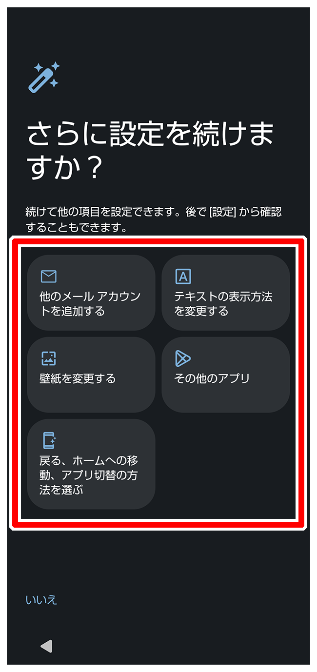 ・ご利用のキャリアサービスやGoogleの設定画面などが表示された場合は、画面に従って設定します。